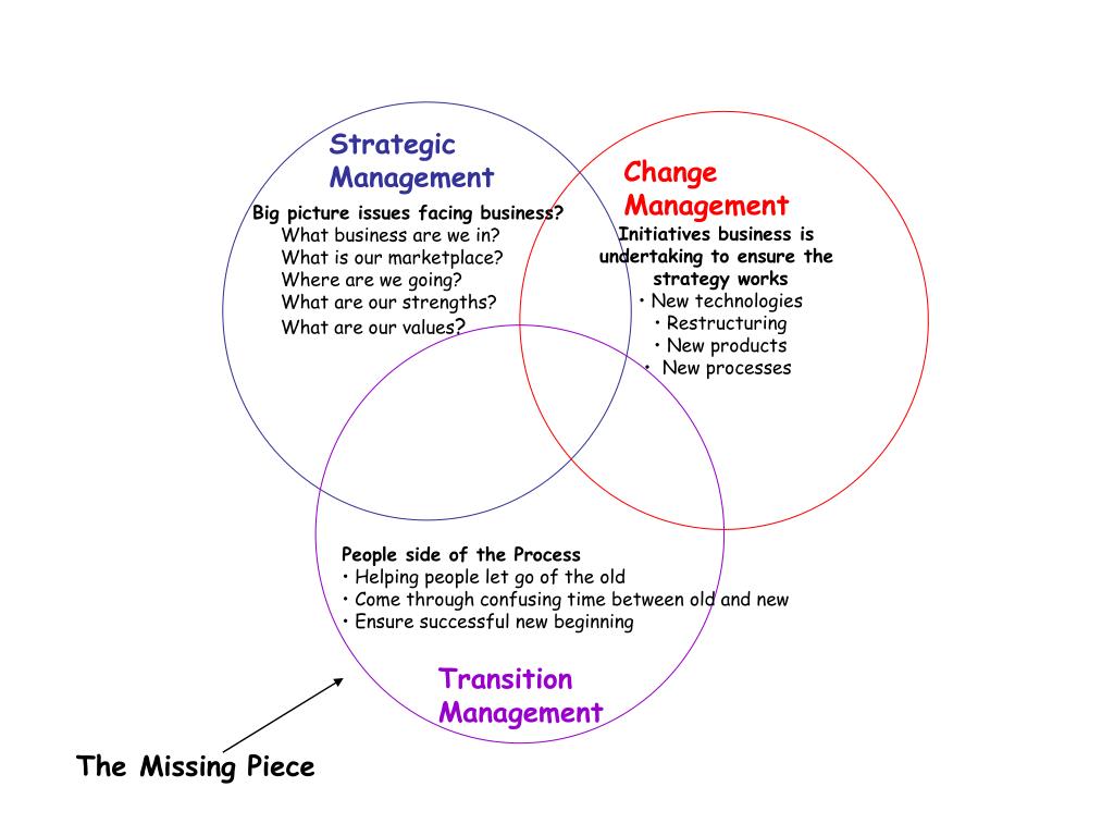Strategic Management Change Management Big picture issues facing business? What business are we in? What is our marketplace? Where are we going? What are our strengths? What are our values? • Initiatives business is • undertaking to ensure the • strategy works • New technologies • Restructuring • New products • New processes • People side of the Process • Helping people let go of the old • Come through confusing time between old and new • Ensure successful new beginning Transition Management The Missing Piece
