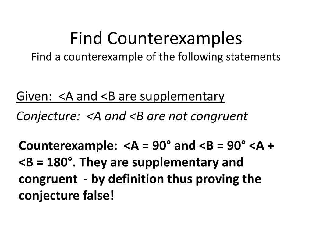 Find Counterexamples Find a counterexample of the following statements Given: <A and <B are supplementary Conjecture: <A and <B are not congruent Counterexample: <A = 90° and <B = 90° <A + <B = 180°. They are supplementary and congruent - by definition thus proving the conjecture false!