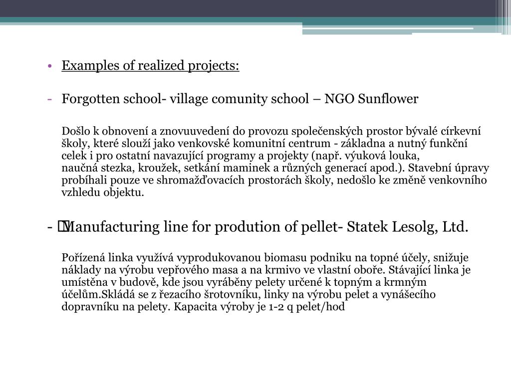 Examplesofrealizedprojects: • Forgottenschool- villagecomunityschool – NGO Sunflower Došlo k obnovení a znovuuvedení do provozu společenských prostor bývalé církevní školy, které slouží jako venkovské komunitní centrum - základna a nutný funkční celek i pro ostatní navazující programy a projekty (např. výuková louka, naučná stezka, kroužek, setkání maminek a různých generací apod.). Stavební úpravy probíhali pouze ve shromažďovacích prostorách školy, nedošlo ke změně venkovního vzhledu objektu. - Manufacturing line forprodutionofpellet- Statek Lesolg, Ltd. Pořízená linka využívá vyprodukovanou biomasu podniku na topné účely, snižuje náklady na výrobu vepřového masa a na krmivo ve vlastní oboře. Stávající linka je umístěna v budově, kde jsou vyráběny pelety určené k topným a krmným účelům.Skládá se z řezacího šrotovníku, linky na výrobu pelet a vynášecího dopravníku na pelety. Kapacita výroby je 1-2 q pelet/hod