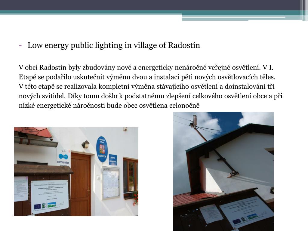 Lowenergy public lighting in villageofRadostín V obci Radostín byly zbudovány nové a energeticky nenáročné veřejné osvětlení. V I. Etapě se podařilo uskutečnit výměnu dvou a instalaci pěti nových osvětlovacích těles. V této etapě se realizovala kompletní výměna stávajícího osvětlení a doinstalování tří nových svítidel. Díky tomu došlo k podstatnému zlepšení celkového osvětlení obce a při nízké energetické náročnosti bude obec osvětlena celonočně