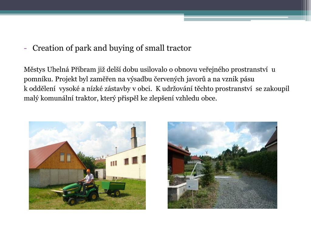 Creationof park andbuyingofsmalltractor Městys Uhelná Příbram již delší dobu usilovalo o obnovu veřejného prostranství u pomníku. Projekt byl zaměřen na výsadbu červených javorů a na vznik pásu k oddělení vysoké a nízké zástavby v obci. K udržování těchto prostranství se zakoupil malý komunální traktor, který přispěl ke zlepšení vzhledu obce.