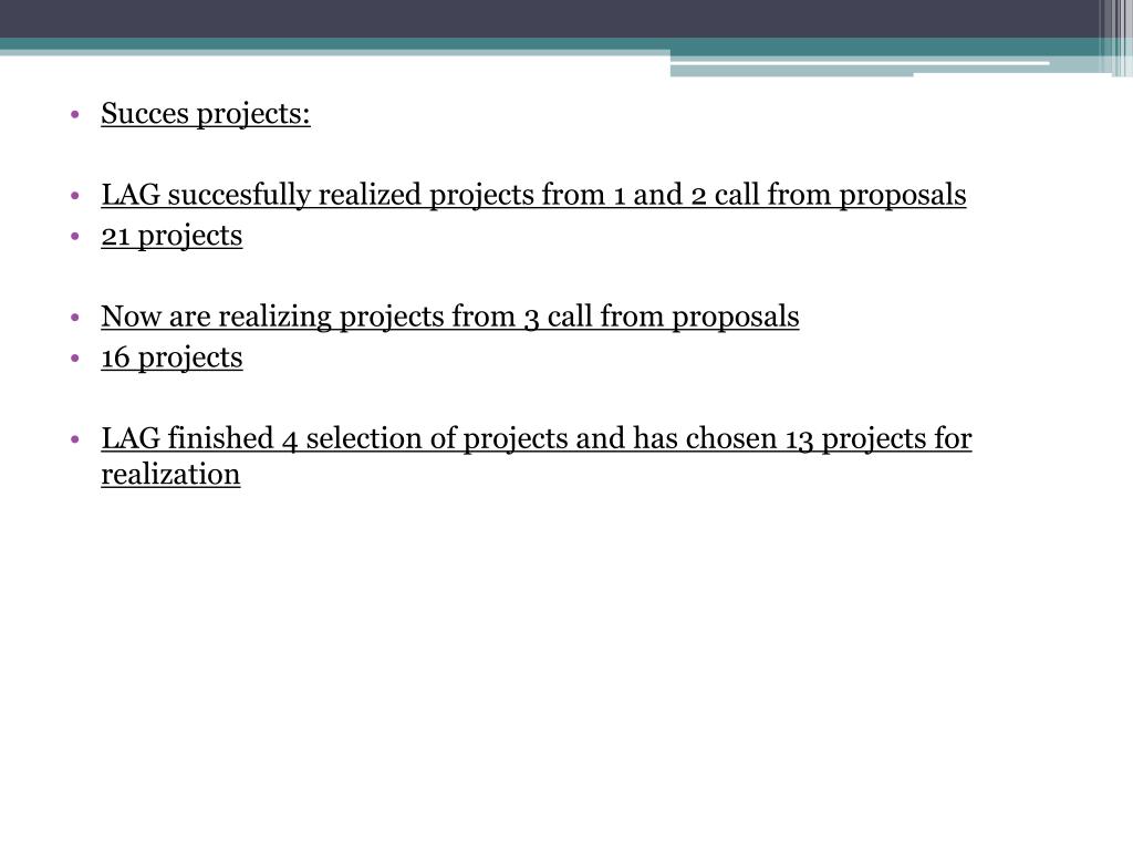 Succesprojects: • LAG succesfullyrealizedprojectsfrom 1 and 2 callfromproposals • 21 projects • Now are realizingprojectsfrom 3 callfromproposals • 16 projects • LAG finished 4 selectionofprojectsand has chosen 13 projectsforrealization