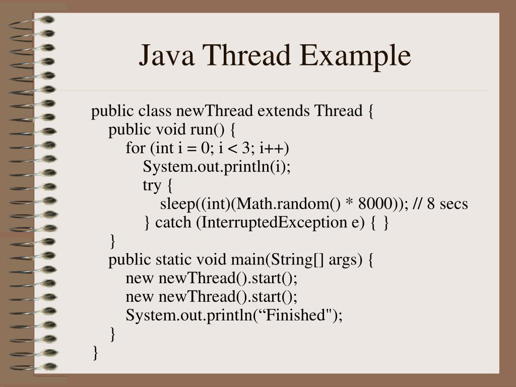 Java Thread Example public class newThread extends Thread { public void run() { for (int i = 0; i < 3; i++) System.out.println(i); try { sleep((int)(Math.random() * 8000)); // 8 secs } catch (InterruptedException e) { } } public static void main(String[] args) { new newThread().start(); new newThread().start(); System.out.println(“Finished"); } }