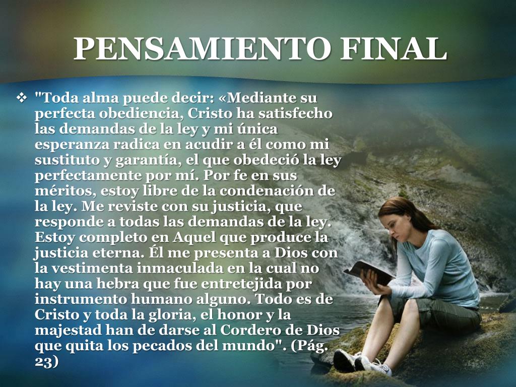 PENSAMIENTO FINAL • "Toda alma puede decir: «Mediante su perfecta obediencia, Cristo ha satisfecho las demandas de la ley y mi única esperanza radica en acudir a él como mi sustituto y garantía, el que obedeció la ley perfectamente por mí. Por fe en sus méritos, estoy libre de la condenación de la ley. Me reviste con su justicia, que responde a todas las demandas de la ley. Estoy completo en Aquel que produce la justicia eterna. Él me presenta a Dios con la vestimenta inmaculada en la cual no hay una hebra que fue entretejida por instrumento humano alguno. Todo es de Cristo y toda la gloria, el honor y la majestad han de darse al Cordero de Dios que quita los pecados del mundo". (Pág. 23)