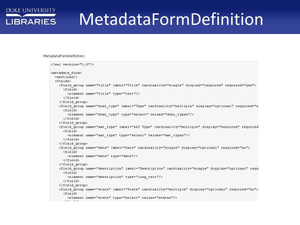 Metadata Application Profiles • Metadata editing page built on the fly • Built using metadata application profile • Includes metadata validation • Includes instruction on how to edit metadata MetadataFormDefinition + Metadata = MetadataForm