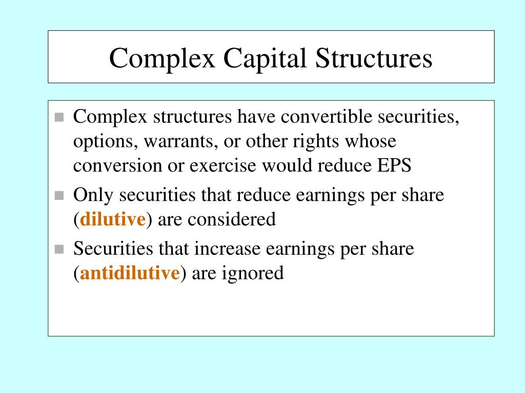 Complex Capital Structures • Complex structures have convertible securities, options, warrants, or other rights whose conversion or exercise would reduce EPS • Only securities that reduce earnings per share (dilutive) are considered • Securities that increase earnings per share (antidilutive) are ignored