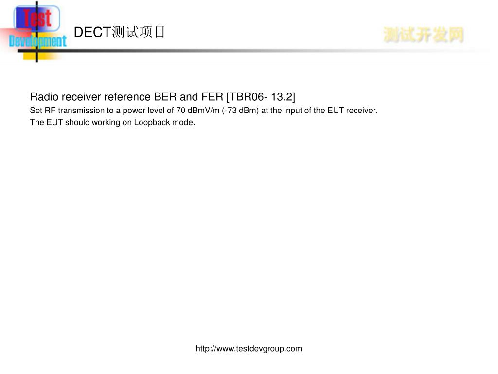 DECT测试项目 Radio receiver reference BER and FER [TBR06- 13.2] Set RF transmission to a power level of 70 dBmV/m (-73 dBm) at the input of the EUT receiver. The EUT should working on Loopback mode. http://www.testdevgroup.com