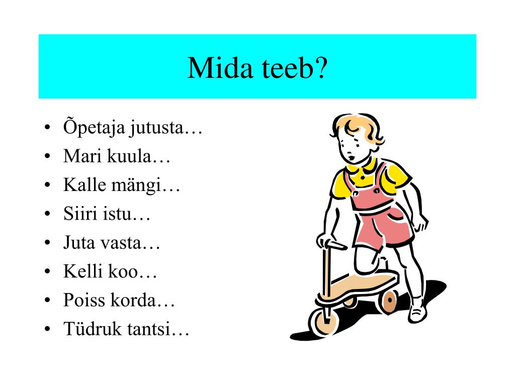 Mida teeb? • Õpetaja jutusta… • Mari kuula… • Kalle mängi… • Siiri istu… • Juta vasta… • Kelli koo… • Poiss korda… • Tüdruk tantsi…