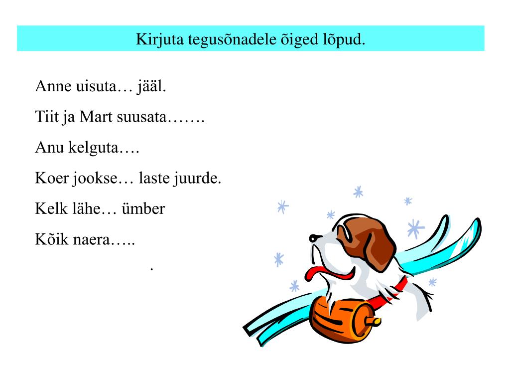 Kirjuta tegusõnadele õiged lõpud. Anne uisuta… jääl. Tiit ja Mart suusata……. Anu kelguta…. Koer jookse… laste juurde. Kelk lähe… ümber Kõik naera….. .
