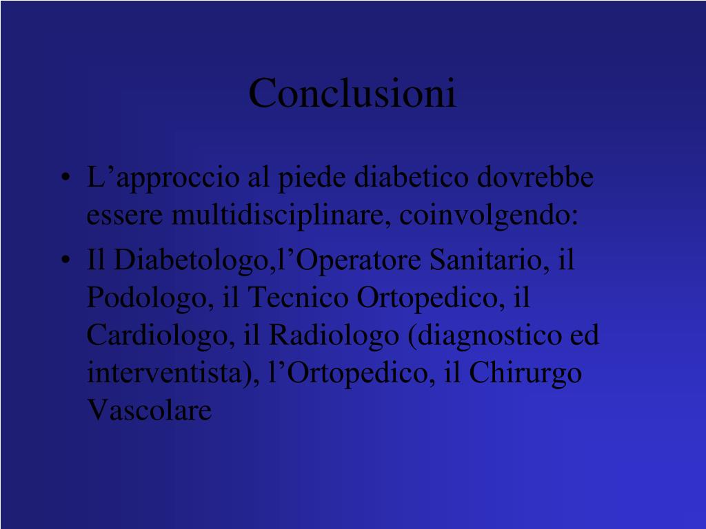 Conclusioni • L’approccio al piede diabetico dovrebbe essere multidisciplinare, coinvolgendo: • Il Diabetologo,l’Operatore Sanitario, il Podologo, il Tecnico Ortopedico, il Cardiologo, il Radiologo (diagnostico ed interventista), l’Ortopedico, il Chirurgo Vascolare