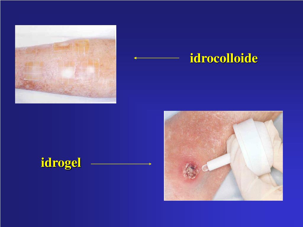 MEDICAZIONI AVANZATE idrogel (Intrasite,Duoderm,Askina) fase necrotica idrocolloidi (Duoderm) fase di infezione fase con fibrina e slough fase di granulazione fase di epitelizzazione
