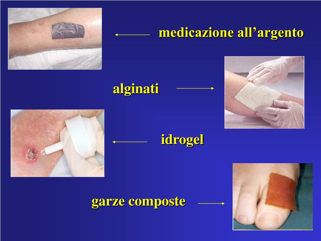 si definisce un materiale di copertura che ha caratteristiche di biocompatibilità MEDICAZIONI AVANZATE Alginati:molto assorbenti e con capacità emostatica Garze composte Idrocolloidi:a contatto con la lesione formano un gel Idrofibre: simili agli alginati,ma senza potere emostatico Idrogel:indicati su lesioni asciutte o necrotiche Medicazioni non aderenti Medicazioni all’argento:potere antisettico ed adsorbente Pellicole trasparenti:traspiranti Schiume di poliuretano:indicate per lesioni cavitarie