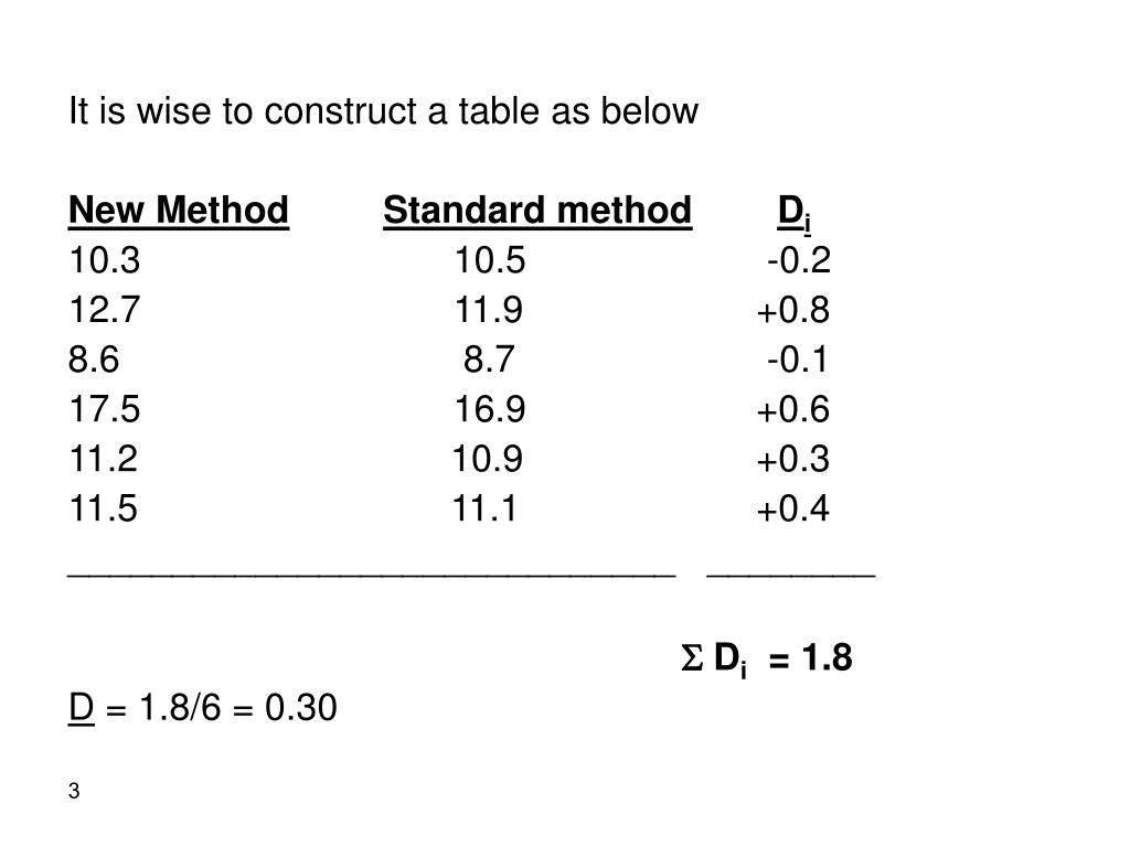 It is wise to construct a table as below New MethodStandard methodDi 10.3 10.5 -0.2 12.7 11.9 +0.8 8.6 8.7 -0.1 17.5 16.9 +0.6 11.2 10.9 +0.3 11.5 11.1 +0.4 _____________________________ ________ S Di = 1.8 D = 1.8/6 = 0.30