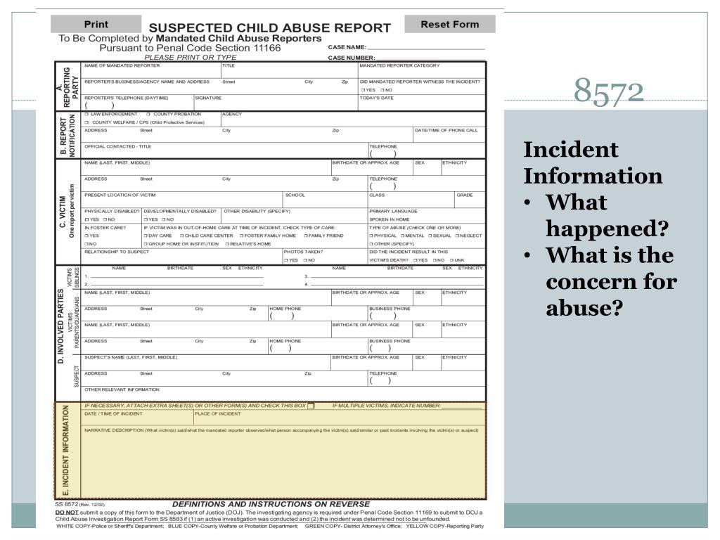 How is a Report Made? • Then in writing • Within 36 hours a written report must be sent to the child protective or law enforcement agency to which the telephone report was made • Must be filed on Department of Justice Form 8572 known as the Suspected Child Abuse Report (SCAR) • This form is available through county welfare departments and local law enforcement agencies • Forms and instructions also available online at http://ag.ca.gov/childabuse/pdf/ss_8572.pdf