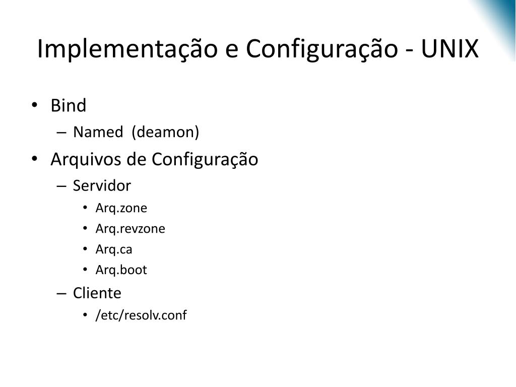 Implementação e Configuração - UNIX • Bind • Named (deamon) • Arquivos de Configuração • Servidor • Arq.zone • Arq.revzone • Arq.ca • Arq.boot • Cliente • /etc/resolv.conf