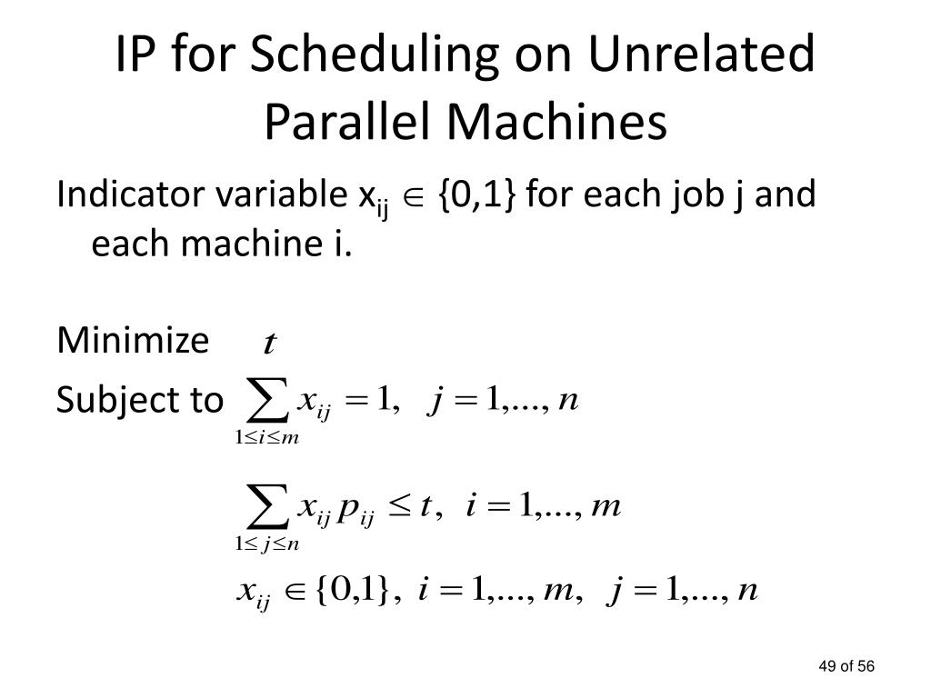 IP for Scheduling on Unrelated Parallel Machines Indicator variable xij {0,1} for each job j and each machine i. Minimize Subject to