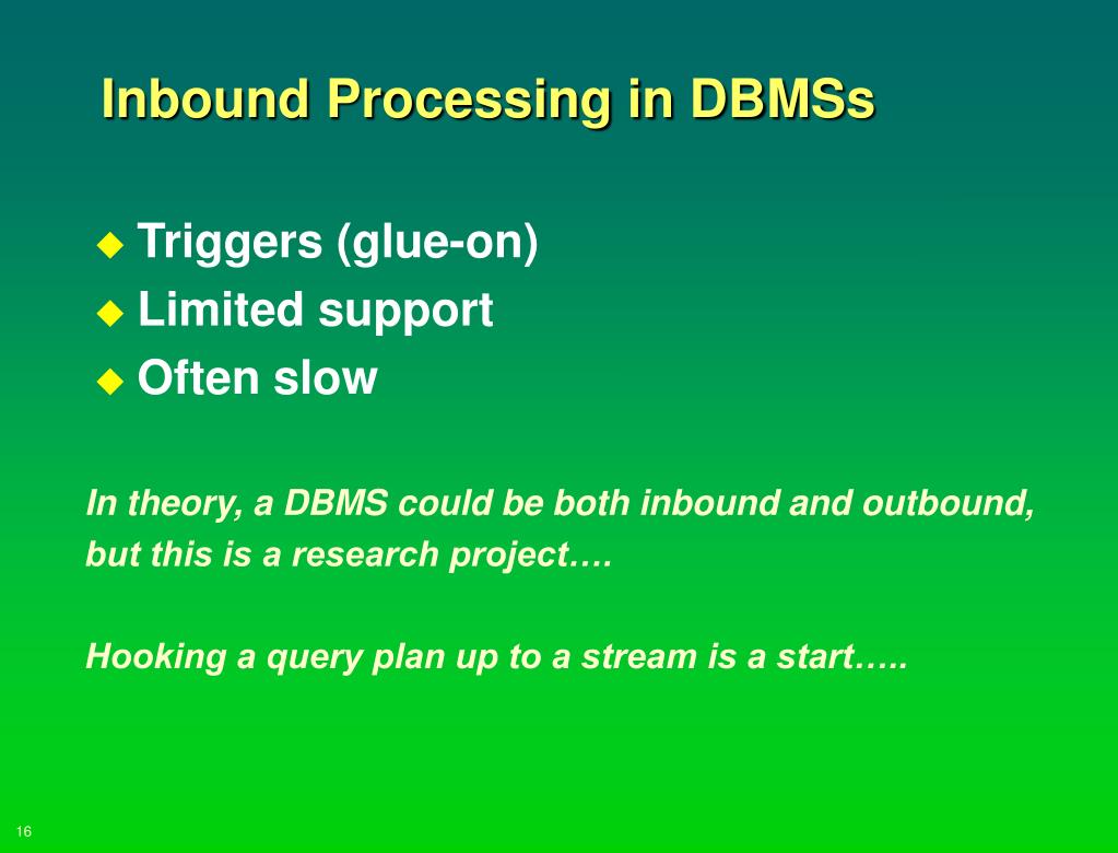 Inbound Processing in DBMSs • Triggers (glue-on) • Limited support • Often slow In theory, a DBMS could be both inbound and outbound, but this is a research project…. Hooking a query plan up to a stream is a start…..