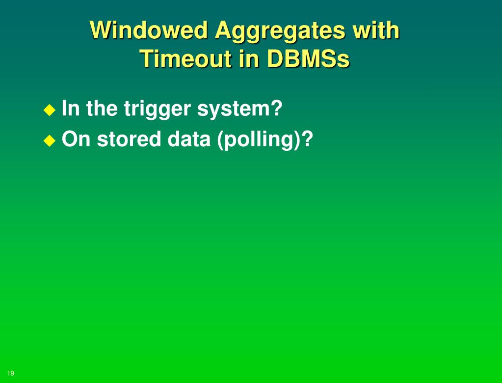 Windowed Aggregates with Timeout in DBMSs • In the trigger system? • On stored data (polling)?