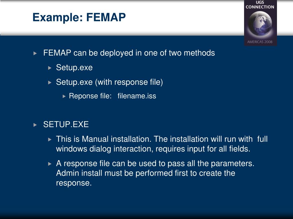 Example: FEMAP • FEMAP can be deployed in one of two methods • Setup.exe • Setup.exe (with response file) • Reponse file: filename.iss • SETUP.EXE • This is Manual installation. The installation will run with full windows dialog interaction, requires input for all fields. • A response file can be used to pass all the parameters. Admin install must be performed first to create the response.