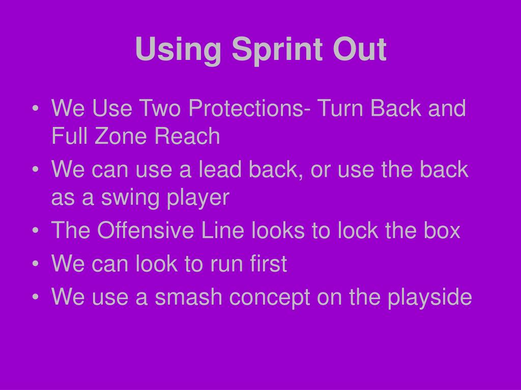Using Sprint Out • We Use Two Protections- Turn Back and Full Zone Reach • We can use a lead back, or use the back as a swing player • The Offensive Line looks to lock the box • We can look to run first • We use a smash concept on the playside