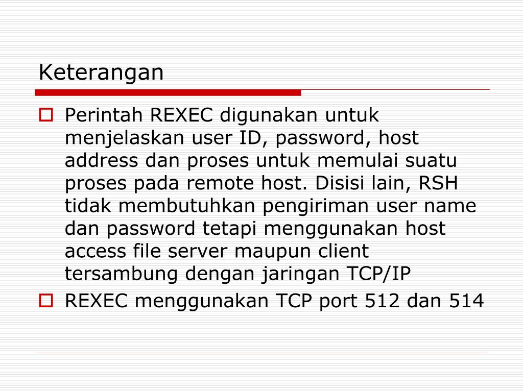 Keterangan • Perintah REXEC digunakan untuk menjelaskan user ID, password, host address dan proses untuk memulai suatu proses pada remote host. Disisi lain, RSH tidak membutuhkan pengiriman user name dan password tetapi menggunakan host access file server maupun client tersambung dengan jaringan TCP/IP • REXEC menggunakan TCP port 512 dan 514