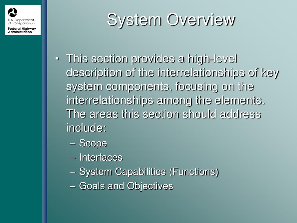 System Overview • This section provides a high-level description of the interrelationships of key system components, focusing on the interrelationships among the elements. The areas this section should address include: • Scope • Interfaces • System Capabilities (Functions) • Goals and Objectives