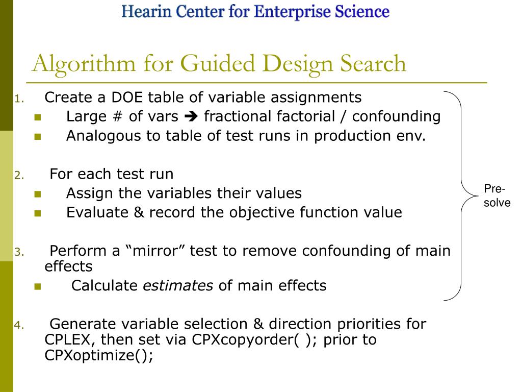 Algorithm for Guided Design Search • Create a DOE table of variable assignments • Large # of vars fractional factorial / confounding • Analogous to table of test runs in production env. • For each test run • Assign the variables their values • Evaluate & record the objective function value • Perform a “mirror” test to remove confounding of main effects • Calculate estimates of main effects • Generate variable selection & direction priorities for CPLEX, then set via CPXcopyorder( ); prior to CPXoptimize(); Pre-solve