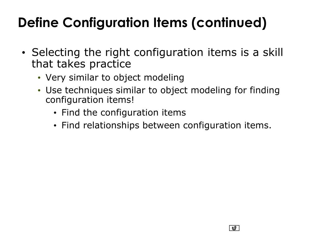 Define Configuration Items (continued) • Selecting the right configuration items is a skill that takes practice • Very similar to object modeling • Use techniques similar to object modeling for finding configuration items! • Find the configuration items • Find relationships between configuration items.