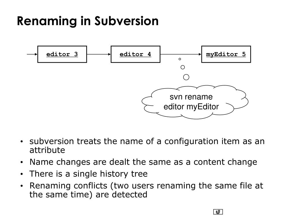 Cvs does not support renaming Instead, the end user renames the file in the working copy removes the old name from the repository adds the new name in the repository The two history trees are disconnected Renaming in CVS cvs remove editor The relation between the two revision trees is lost editor1.3 editor1.4 cvs add myEditor myEditor1.1 myEditor1.2