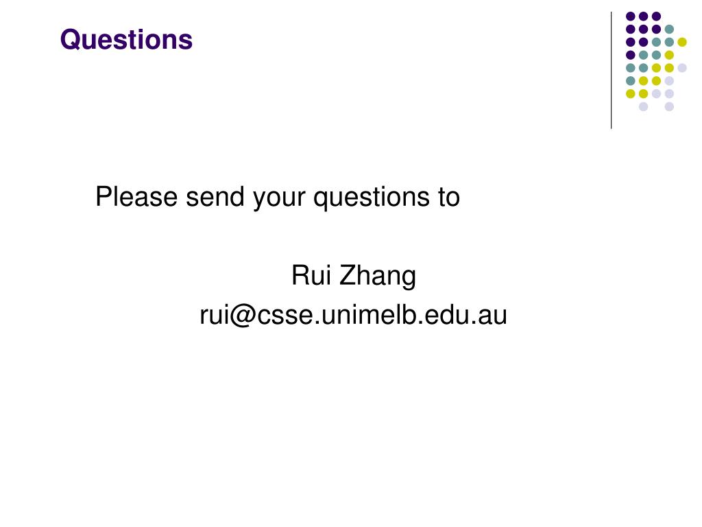 Questions Please send your questions to Rui Zhang rui@csse.unimelb.edu.au