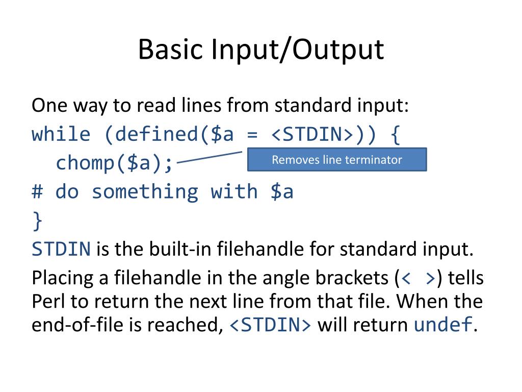 Basic Input/Output One way to read lines from standard input: while (defined($a = <STDIN>)) { chomp($a); # do something with $a } STDIN is the built-in filehandlefor standard input. Placing a filehandle in the angle brackets (< >) tells Perl to return the next line from that file. When the end-of-file is reached, <STDIN> will return undef. Removes line terminator