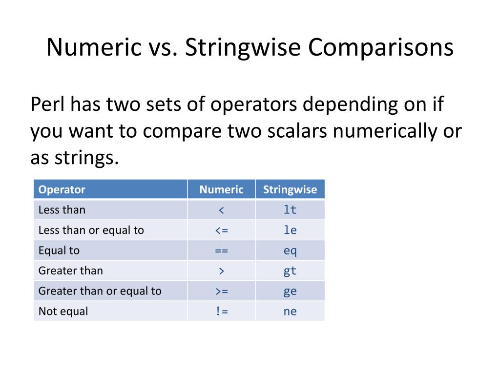 Numeric vs. Stringwise Comparisons Perl has two sets of operators depending on if you want to compare two scalars numerically or as strings.