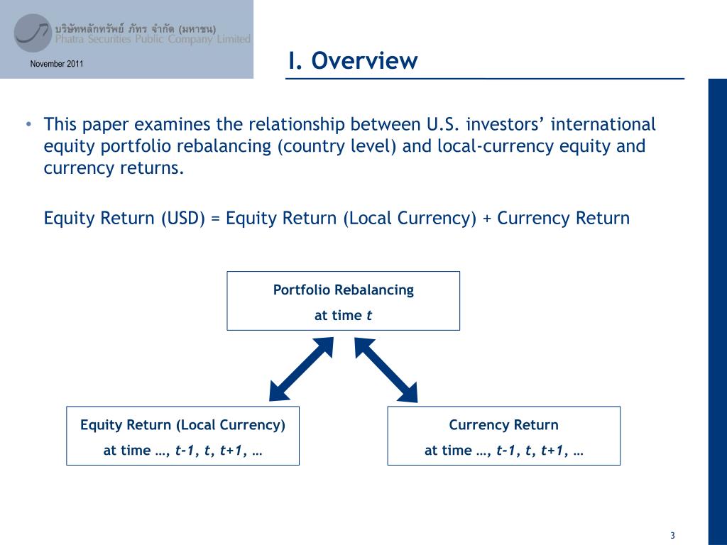 November 2011. Thammasat Finance Conference. Jon Wongswan Phatra Securities jon@phatrasecurities.com. What Influences U.S. International Equity Investment: Equity or Currency Returns? Stephanie Curcuru, Charles Thomas, Frank Warnock, and Jon Wongswan. Outline. Overview