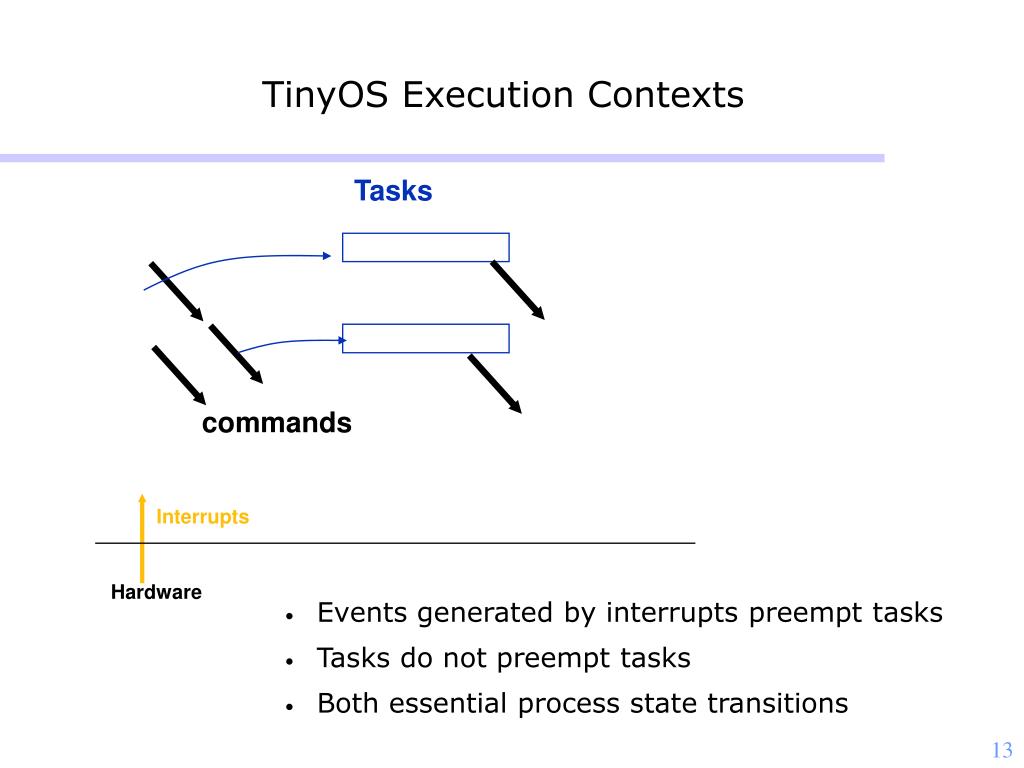 Tasks events commands Interrupts Hardware TinyOS Execution Contexts • Events generated by interrupts preempt tasks • Tasks do not preempt tasks • Both essential process state transitions
