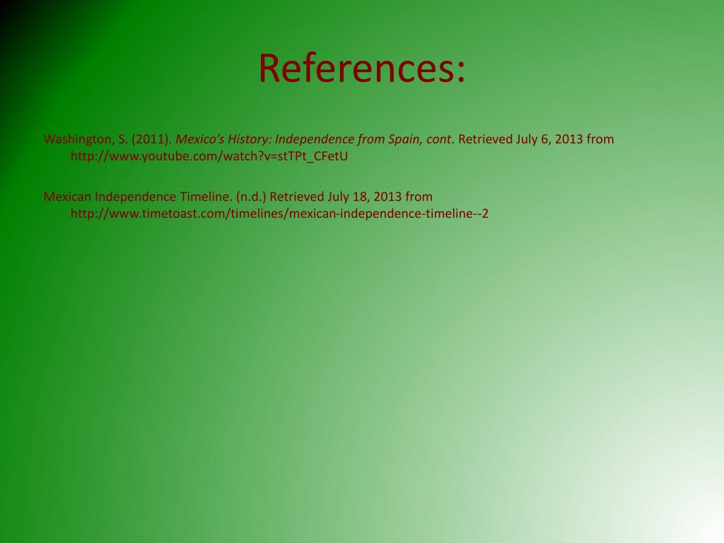 References: Washington, S. (2011). Mexico’s History: Independence from Spain, cont. Retrieved July 6, 2013 fromhttp://www.youtube.com/watch?v=stTPt_CFetU Mexican Independence Timeline. (n.d.) Retrieved July 18, 2013 from http://www.timetoast.com/timelines/mexican-independence-timeline--2