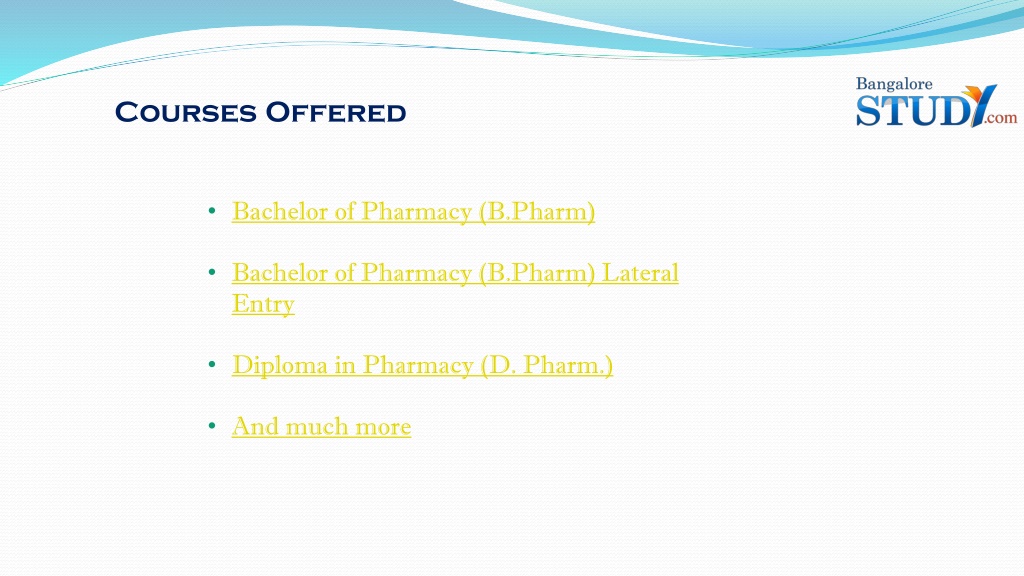 Courses Offered • Bachelor of Pharmacy (B.Pharm) • Bachelor of Pharmacy (B.Pharm) Lateral Entry • Diploma in Pharmacy (D. Pharm.) • And much more
