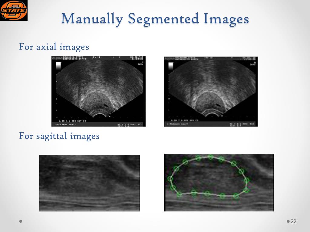 TRUS Image Segmentation • TRUS image segmentation is challenging due to • Complexity in contrast • Image artifacts • Morphological features • Variation in prostate shape and size • Manual contour tracking • Interactive program takes input from user • Sagittal images segmented manually • Used as reference for 3D profile