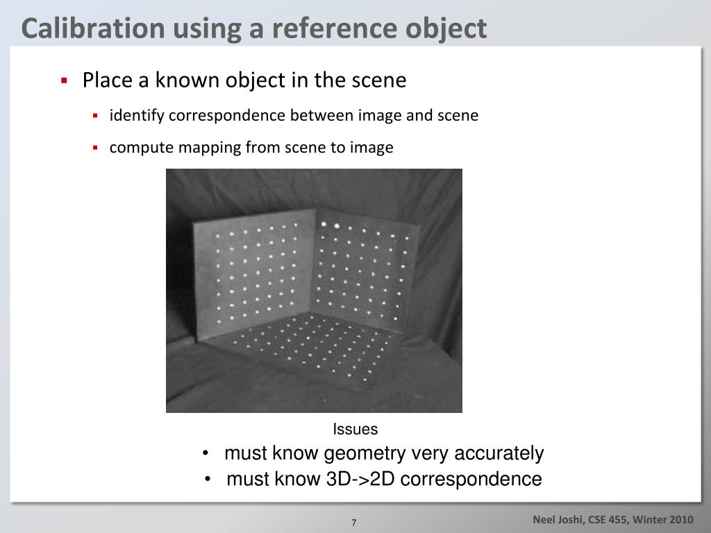 Calibration using a reference object • Place a known object in the scene • identify correspondence between image and scene • compute mapping from scene to image • Issues • must know geometry very accurately • must know 3D->2D correspondence