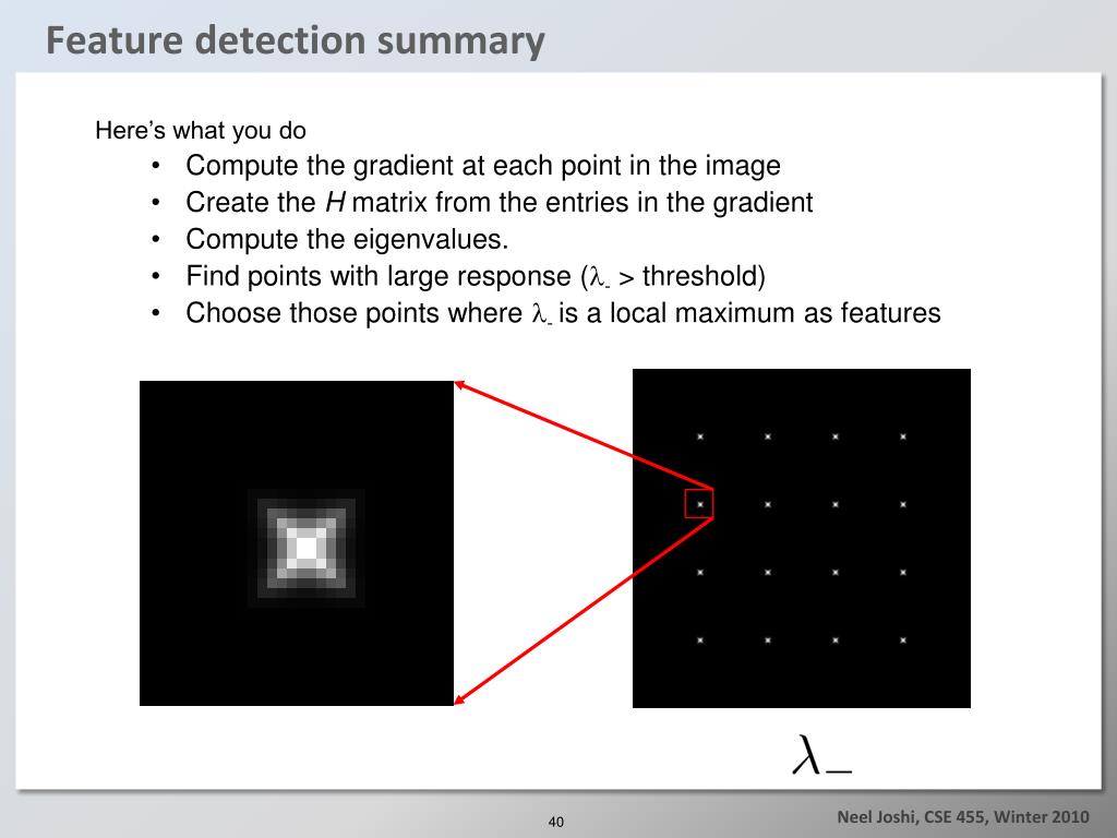 Feature detection summary • Here’s what you do • Compute the gradient at each point in the image • Create the H matrix from the entries in the gradient • Compute the eigenvalues. • Find points with large response (-> threshold) • Choose those points where - is a local maximum as features