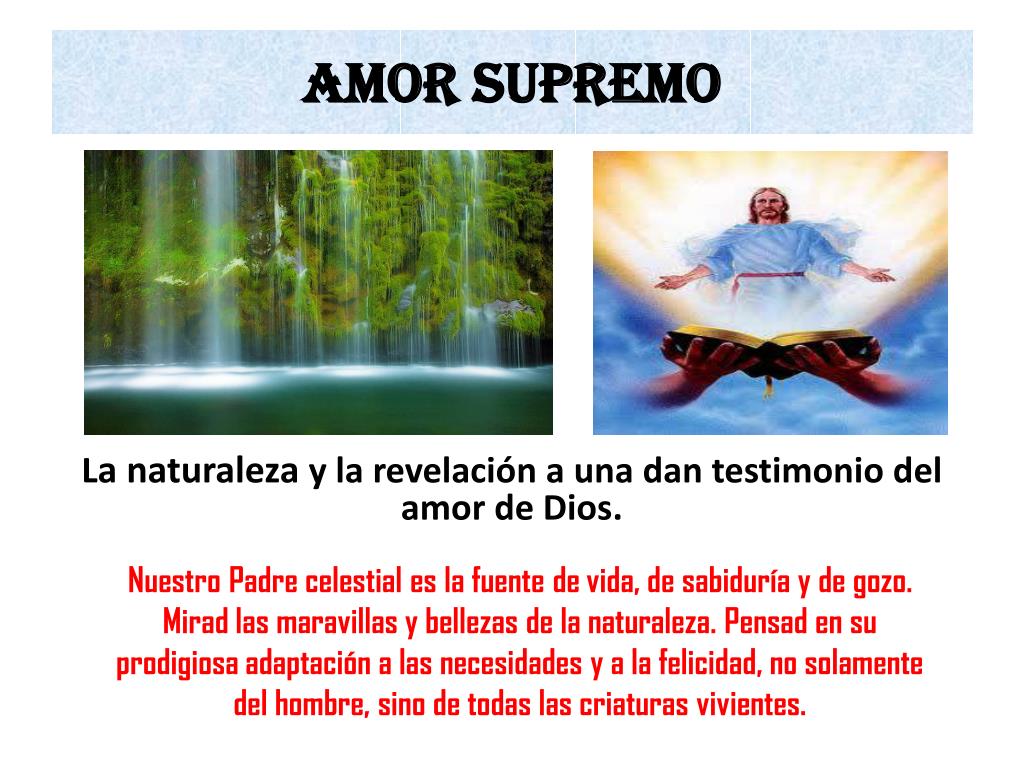 Amor supremo La naturaleza y la revelación a una dan testimonio del amor de Dios. Nuestro Padre celestial es la fuente devida, de sabiduría y de gozo. Mirad las maravillas ybellezas de la naturaleza. Pensad en su prodigiosaadaptación a las necesidades y a la felicidad, no solamentedel hombre, sino de todas las criaturas vivientes.