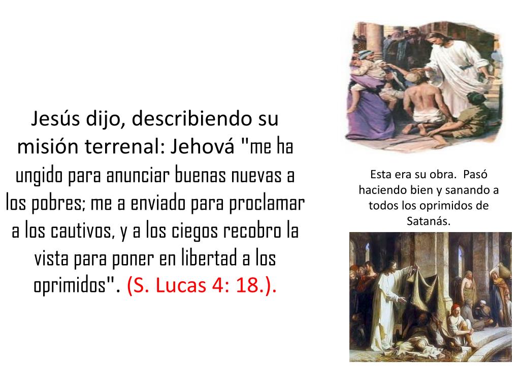 Jesús dijo, describiendo su misión terrenal: Jehová "me ha ungido para anunciar buenas nuevas a los pobres; me a enviado para proclamar a los cautivos, y a los ciegos recobro la vista para poner en libertad a los oprimidos". (S. Lucas 4: 18.). Esta era su obra. Pasó haciendo bien y sanando a todos los oprimidos de Satanás.