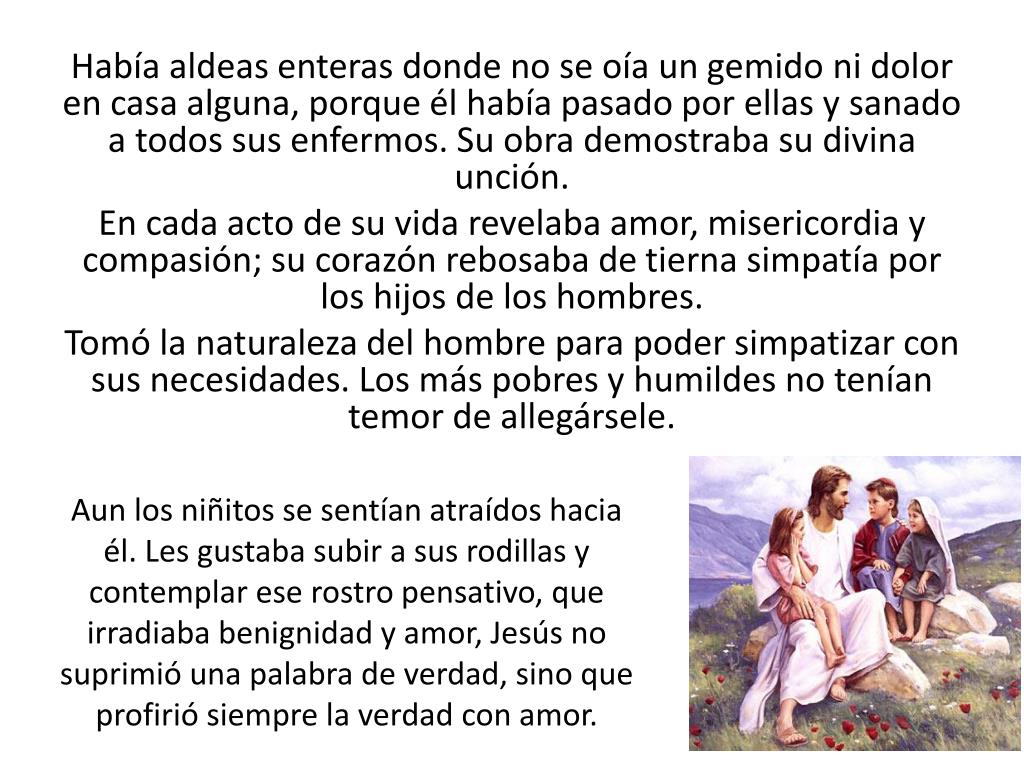 Había aldeas enteras donde no se oía un gemido ni dolor en casa alguna, porque él había pasado por ellas y sanado a todos sus enfermos. Su obra demostraba su divina unción. En cada acto de su vida revelaba amor, misericordia y compasión; su corazón rebosaba de tierna simpatía por los hijos de los hombres. Tomó la naturaleza del hombre para poder simpatizar con sus necesidades. Los más pobres y humildes no tenían temor de allegársele. Aun los niñitos se sentían atraídos hacia él. Les gustaba subir a sus rodillas y contemplar ese rostro pensativo, que irradiaba benignidad y amor, Jesús no suprimió una palabra de verdad, sino que profirió siempre la verdad con amor.