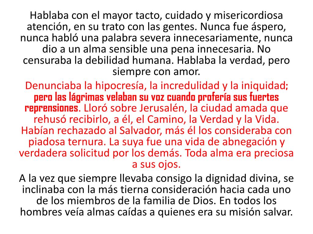 Hablaba con el mayor tacto, cuidado y misericordiosa atención, en su trato con las gentes. Nunca fue áspero, nunca habló una palabra severa innecesariamente, nunca dio a un alma sensible una pena innecesaria. No censuraba la debilidad humana. Hablaba la verdad, pero siempre con amor. Denunciaba la hipocresía, la incredulidad y la iniquidad; pero las lágrimas velaban su voz cuando profería sus fuertes reprensiones. Lloró sobre Jerusalén, la ciudad amada que rehusó recibirlo, a él, el Camino, la Verdad y la Vida. Habían rechazado al Salvador, más él los consideraba con piadosa ternura. La suya fue una vida de abnegación y verdadera solicitud por los demás. Toda alma era preciosa a sus ojos. A la vez que siempre llevaba consigo la dignidad divina, se inclinaba con la más tierna consideración hacia cada uno de los miembros de la familia de Dios. En todos los hombres veía almas caídas a quienes era su misión salvar.