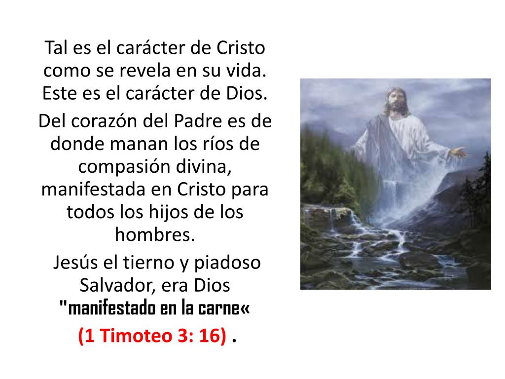 Tal es el carácter de Cristo como se revela en su vida.Este es el carácter de Dios. Del corazón del Padre es dedonde manan los ríos de compasión divina, manifestadaen Cristo para todos los hijos de los hombres. Jesús eltierno y piadoso Salvador, era Dios "manifestado en lacarne« (1 Timoteo 3: 16) .
