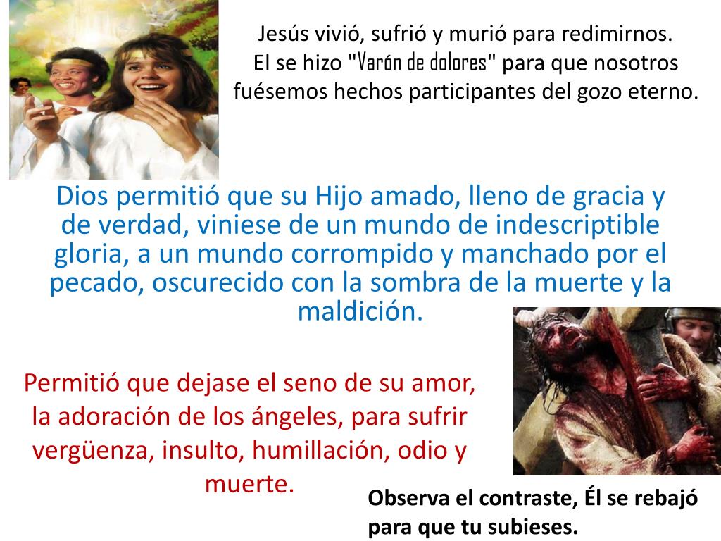Jesús vivió, sufrió y murió para redimirnos. El se hizo "Varón de dolores" para que nosotros fuésemos hechos participantes del gozo eterno. Dios permitió que su Hijo amado, lleno de gracia y de verdad, viniese de un mundo de indescriptible gloria, a un mundo corrompido y manchado por el pecado, oscurecido con la sombra de la muerte y la maldición. Permitió que dejase el seno de su amor, la adoración de los ángeles, para sufrir vergüenza, insulto, humillación, odio y muerte. Observa el contraste, Él se rebajó para que tu subieses.