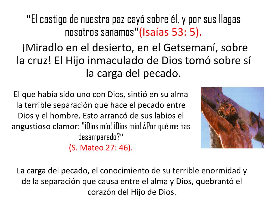 "El castigo de nuestra paz cayó sobre él, y por sus llagas nosotros sanamos"(Isaías 53: 5). ¡Miradlo en el desierto, en el Getsemaní, sobre la cruz! El Hijo inmaculado de Dios tomó sobre sí la carga del pecado. El que había sido uno con Dios, sintió en su alma la terrible separación que hace el pecado entre Dios y el hombre. Esto arrancó de sus labios el angustioso clamor: "¡Dios mío! ¡Dios mío! ¿Por qué me has desamparado?" (S. Mateo 27: 46). La carga del pecado, el conocimiento de su terrible enormidad y de la separación que causa entre el alma y Dios, quebrantó el corazón del Hijo de Dios.