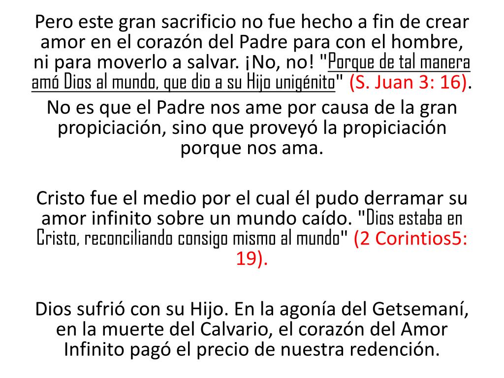 Pero este gran sacrificio no fue hecho a fin de crear amor en el corazón del Padre para con el hombre, ni para moverlo a salvar. ¡No, no! "Porque de tal manera amó Dios al mundo, que dio a su Hijo unigénito" (S. Juan 3: 16). Noes que el Padre nos ame por causa de la gran propiciación, sino que proveyó la propiciación porque nos ama. Cristo fue el medio por el cual él pudo derramar su amor infinito sobre un mundo caído. "Dios estaba en Cristo, reconciliando consigo mismo al mundo" (2 Corintios5: 19). Dios sufrió con su Hijo. En la agonía del Getsemaní, en la muerte del Calvario, el corazón del Amor Infinito pagó el precio de nuestra redención.