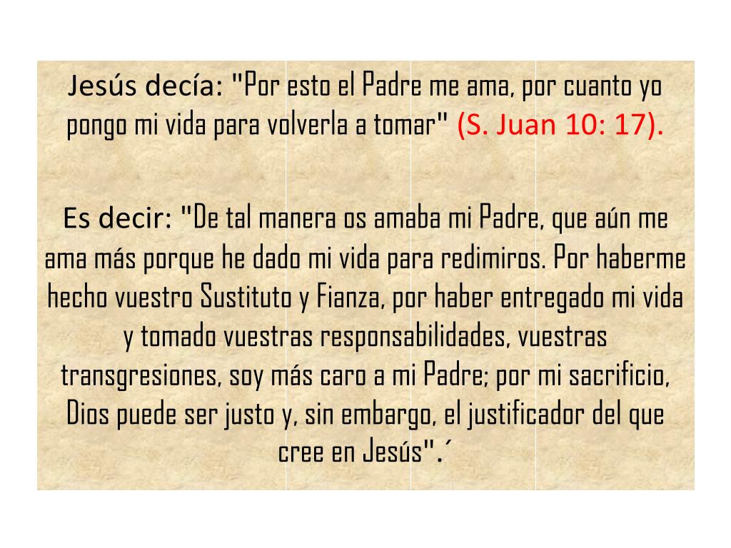 Jesús decía: "Por esto el Padre me ama, por cuanto yo pongo mi vida para volverla a tomar" (S. Juan 10: 17). Es decir: "De tal manera os amaba mi Padre, que aún me ama más porque he dado mi vida para redimiros. Por haberme hecho vuestro Sustituto y Fianza, por haber entregado mi vida y tomado vuestras responsabilidades, vuestras transgresiones, soy más caro a mi Padre; por mi sacrificio, Dios puede ser justo y, sin embargo, el justificador del que cree en Jesús".´
