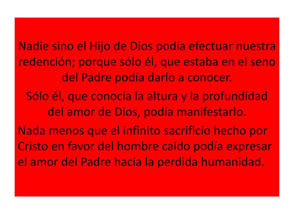 Nadie sino el Hijo de Dios podía efectuar nuestra redención; porque sólo él, que estaba en el seno del Padre podía darlo a conocer. Sólo él, que conocía la altura y la profundidad del amor de Dios, podía manifestarlo. Nada menos que el infinito sacrificio hecho por Cristo en favor del hombre caído podía expresar el amor del Padre hacia la perdida humanidad.