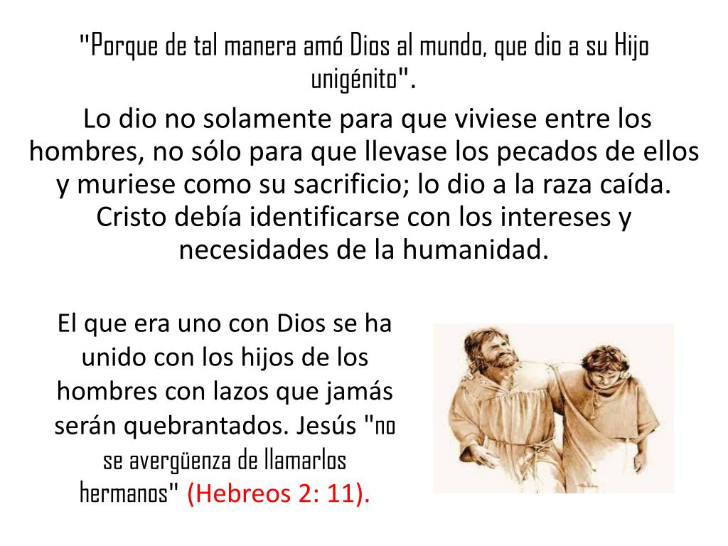 "Porque de tal manera amó Dios al mundo, que dio a su Hijo unigénito". Lo dio no solamente para que viviese entre los hombres, no sólo para que llevase los pecados de ellos y muriese como su sacrificio; lo dio a la raza caída. Cristo debía identificarse con los intereses y necesidades de la humanidad. El que era uno con Dios se ha unido con los hijos de los hombres con lazos que jamás serán quebrantados. Jesús "no se avergüenza de llamarlos hermanos" (Hebreos 2: 11).